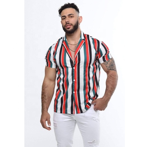 Dropship男士条纹上衣休闲短袖宽松合身纽扣羽绒服夏季沙滩上衣